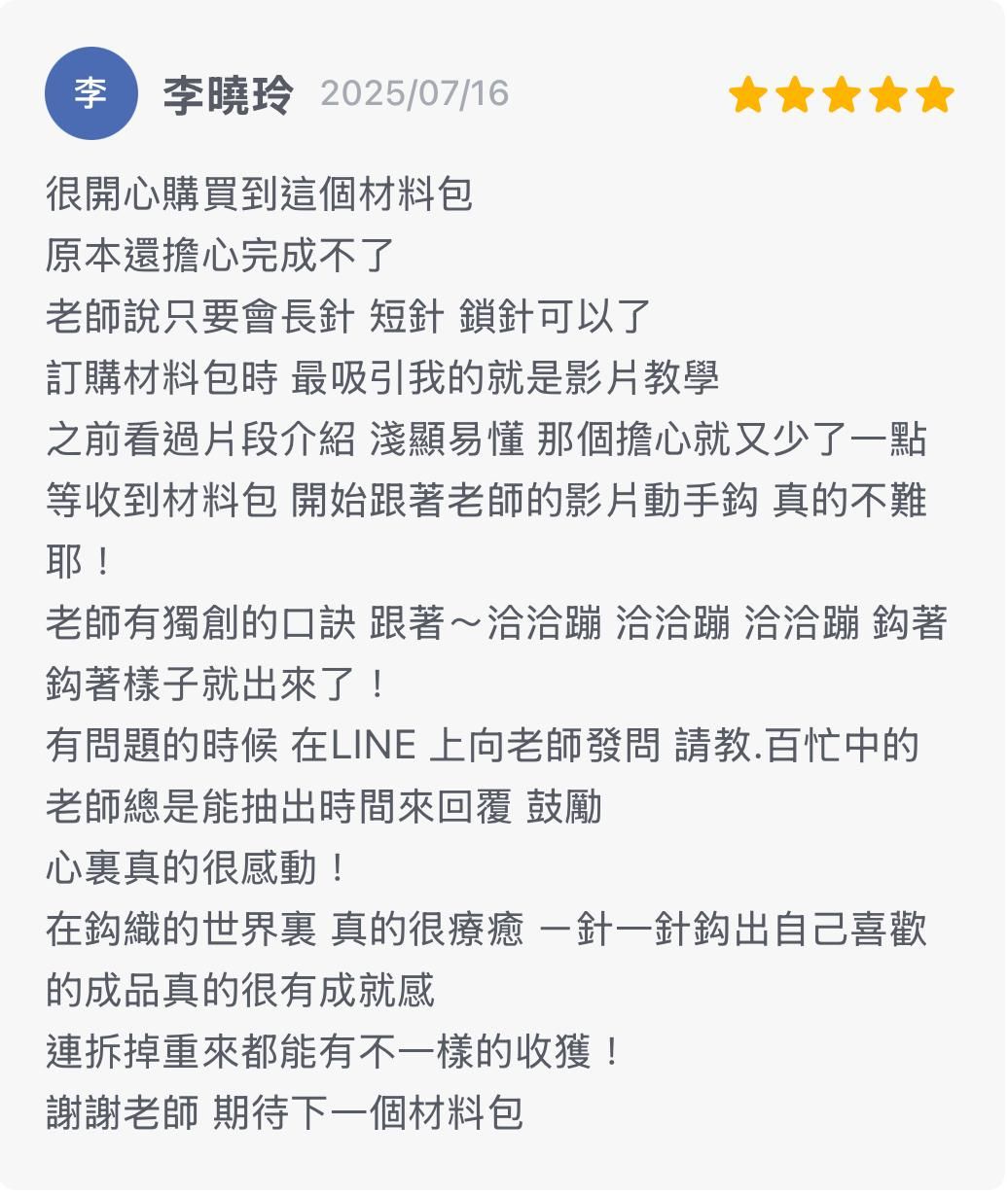 🔺此為超值影音材料包課程,購買後能獲得『教學影片』+『毛線』,下單後,請務必填寫好正確姓名、手機、地址,方可幫您寄送到府。若需寄到超商,請於地址欄位填寫 「全家」or「7-11」,以及門市名稱。如「7-11長津門市」,或是「全家龜山門市」,就能超商取貨。(限全家、7-11)