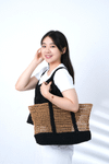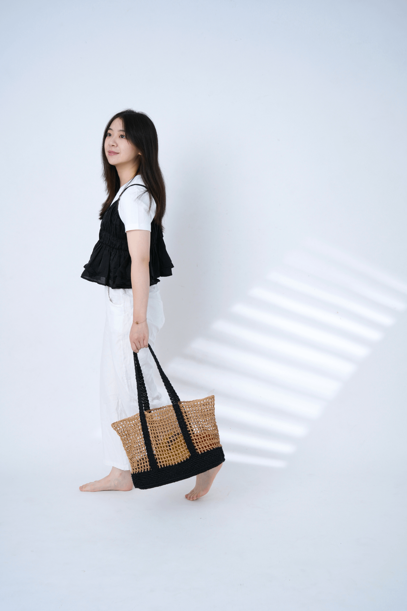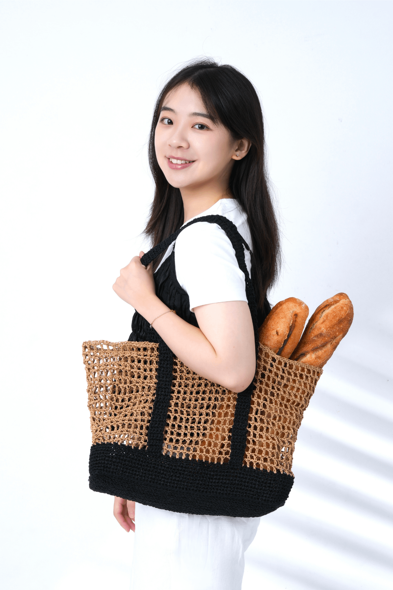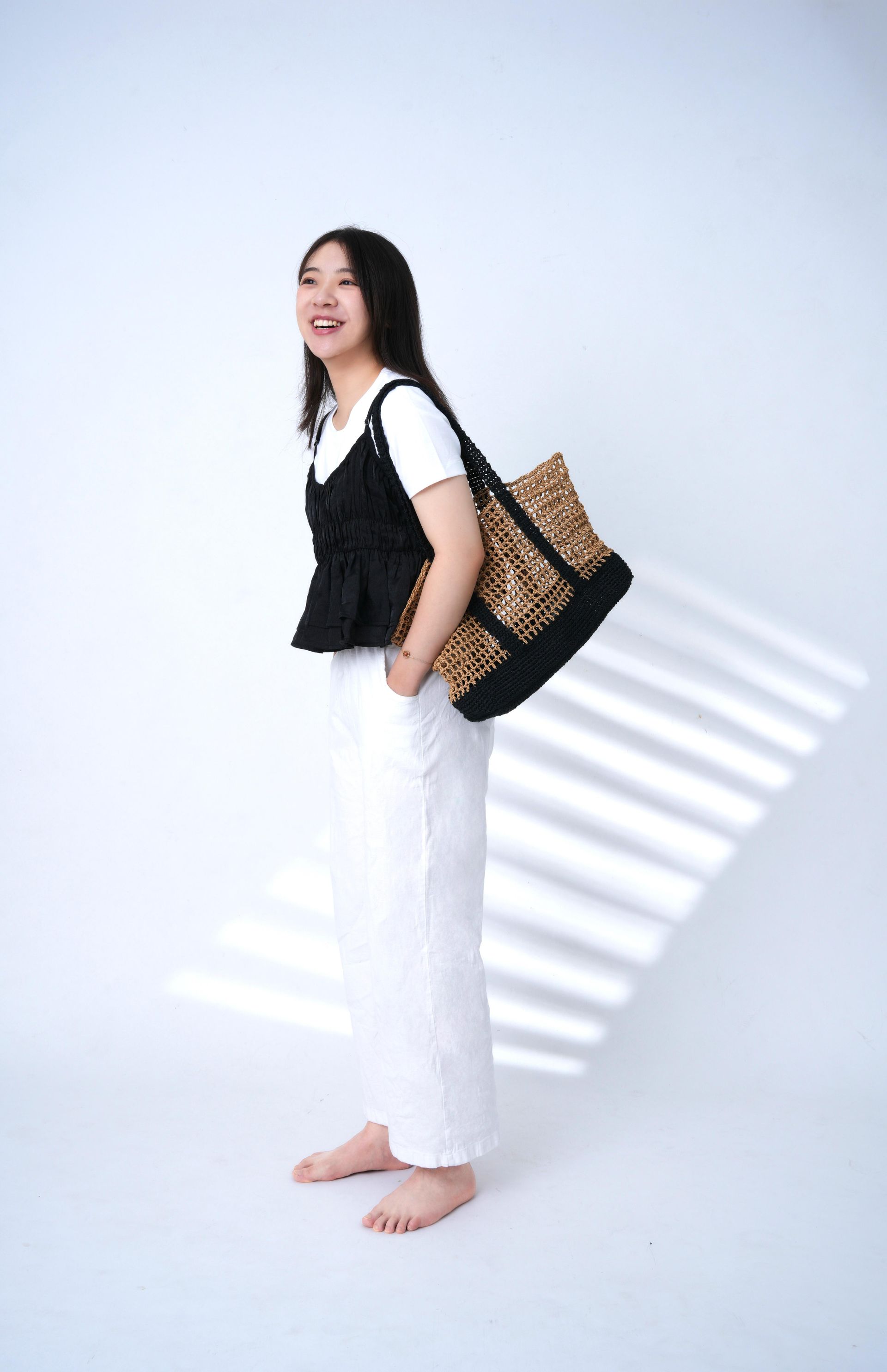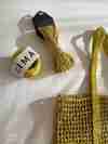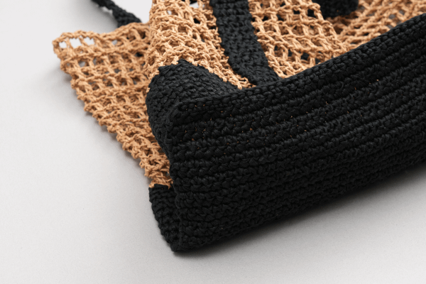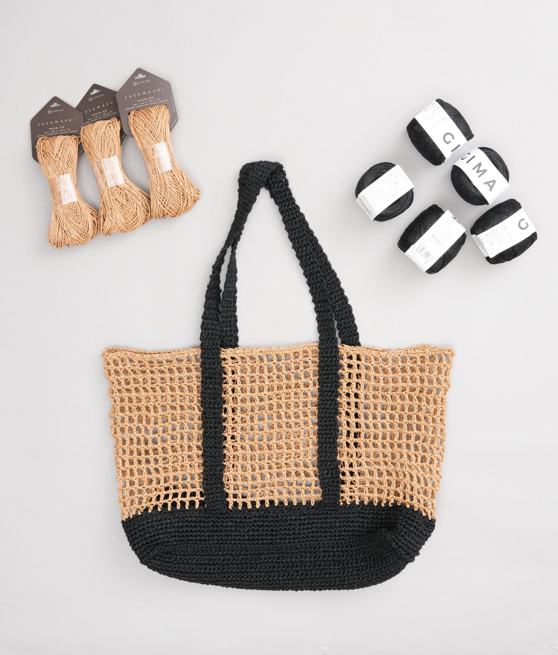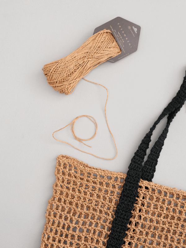 兩種日本進口線材搭配得剛剛好:SASAWASHI 竹線有自然光澤,看起來乾淨有氣質,GIMA 棉麻線則讓包包有挺度不易變形,輕盈又結實。還有個小優點——黑色的包底和提把超耐髒,日常用也不怕。兩種搭配剛剛好!